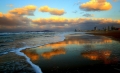 在我眼中,金沙滩如上苍从袖口里不经意洒落在华夏版图上的一条碧得让人眼亮、神秘得令人窒息的“流金海岸”。海湾依着岬角,岬角抱着海湾,海湾的波涛为岬角平添了一弧“雪浪篱笆”,岬角的“金沙滩”又为海湾镶上一道“金色花边”。她美得让人心悸的,神秘的让人心颤。我爱金沙滩,她色彩斑斓,就在我的家门口边。